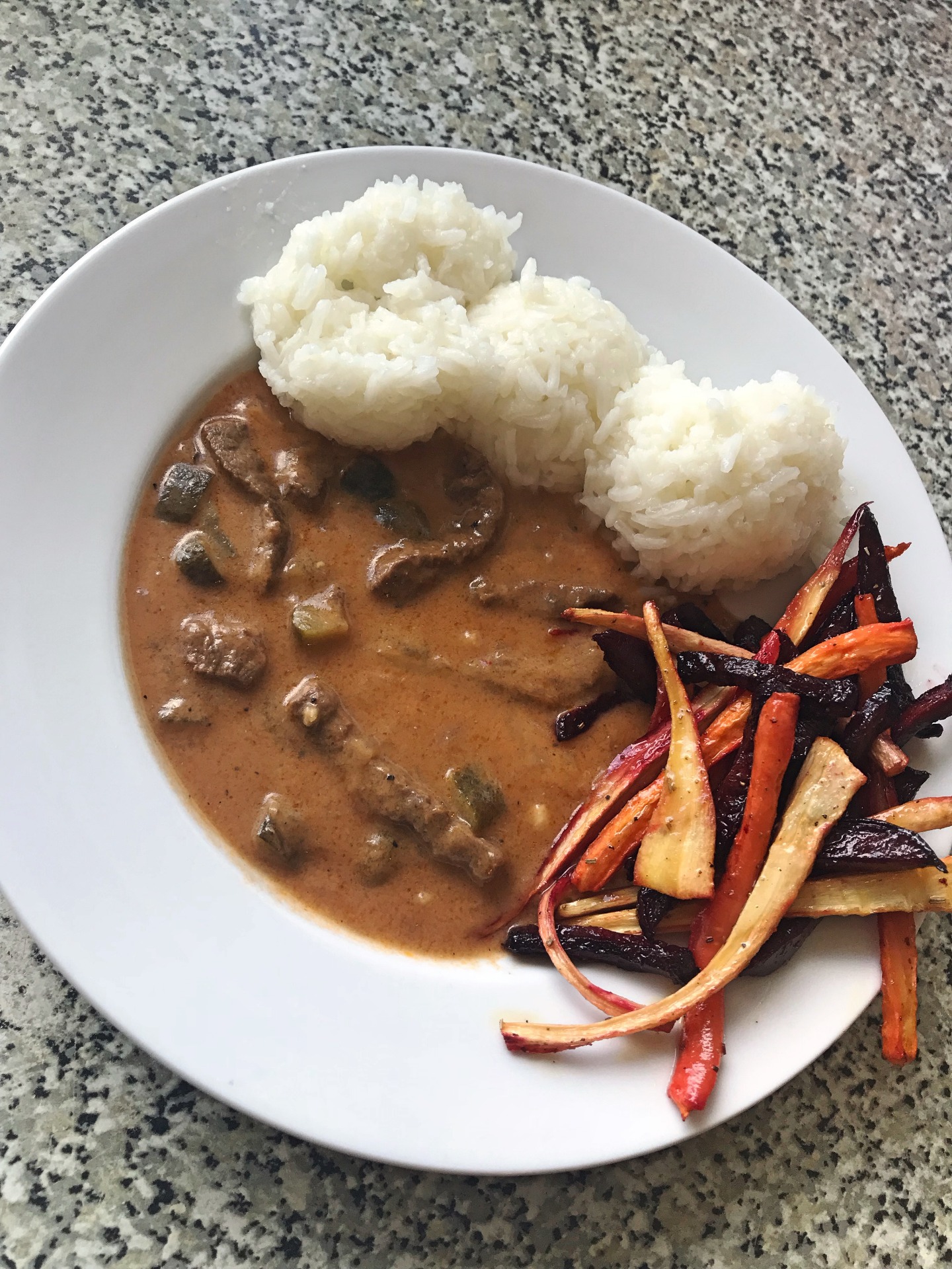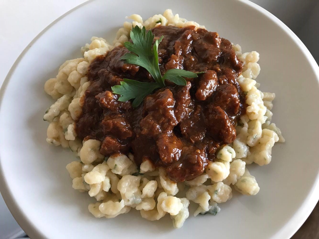 Hovädzí guláš s bylinkovými haluškami a slivkovým lekvárom.